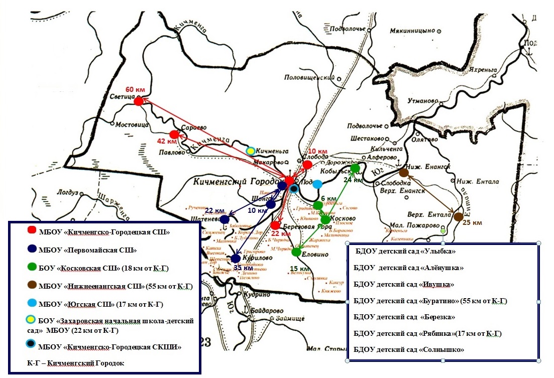 Систему образования Кичменгско-Городецкого муниципального района представляют: 7 дошкольных образовательных организаций, 6 общеобразовательных организаций, 1 специальная (коррекционная) школа - интерант, 1 организация дополнительного образования детей