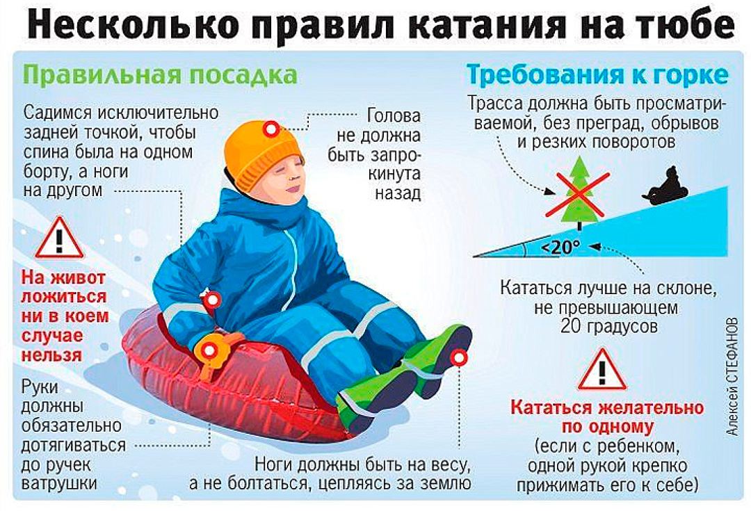 Не отпускайте детей кататься одних, желательно страховать ребенка вверху и внизу cпускa. Перед спуском убедитесь, что трасса свободна и ничего не представляет опасности, спускайтесь на ватрушке строго по очереди.