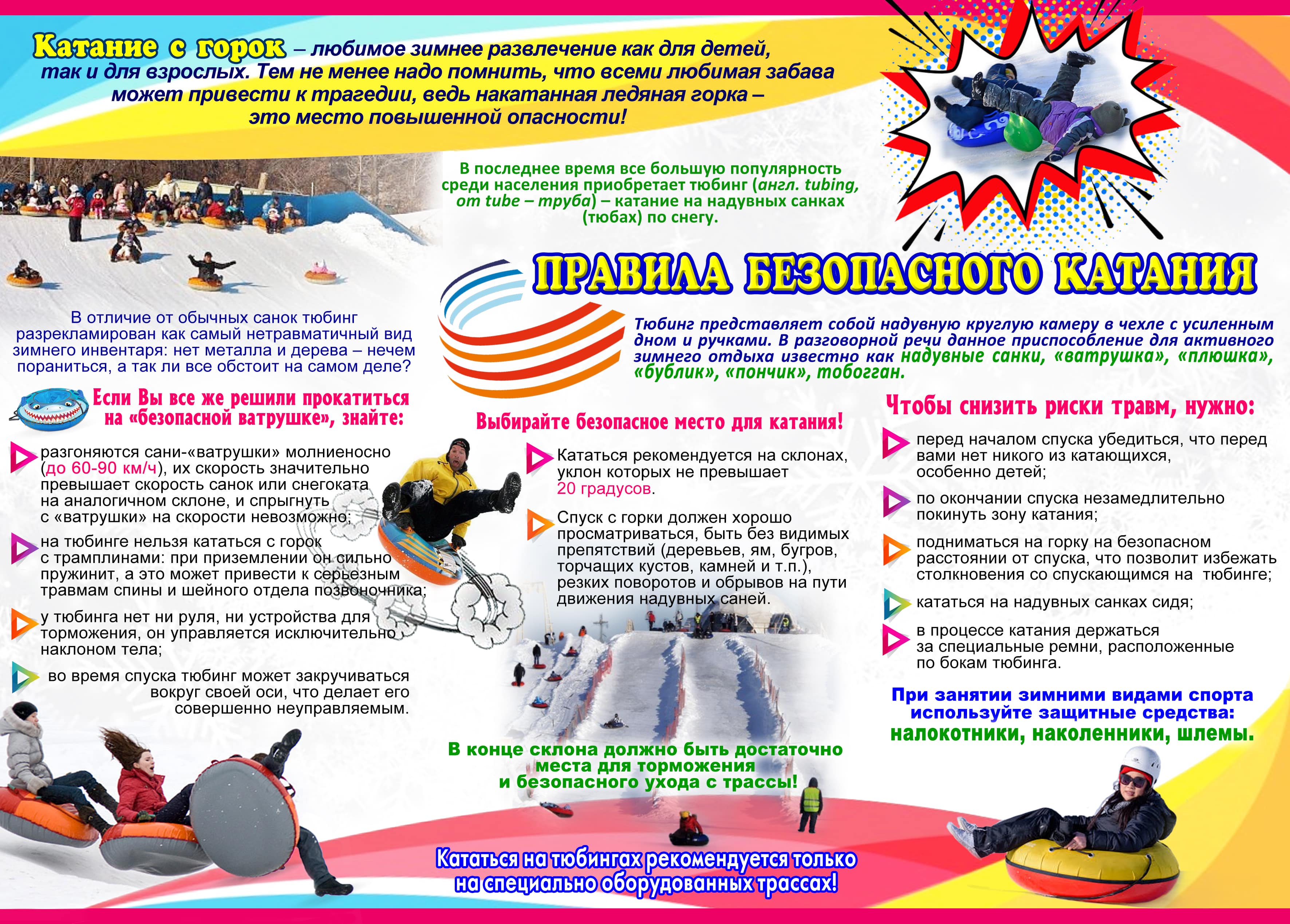 В связи с чем так опасны ватрушки? Это высокая скорость, неуправляемость, невозможность торможения, невнимательность, алкогольное опьянение (актyально для взрослых), когда человек не может оценить все риски. Однако, это не значит, что кататься запрещено. Нужно делать это осторожно, с учетом правил безопасности.