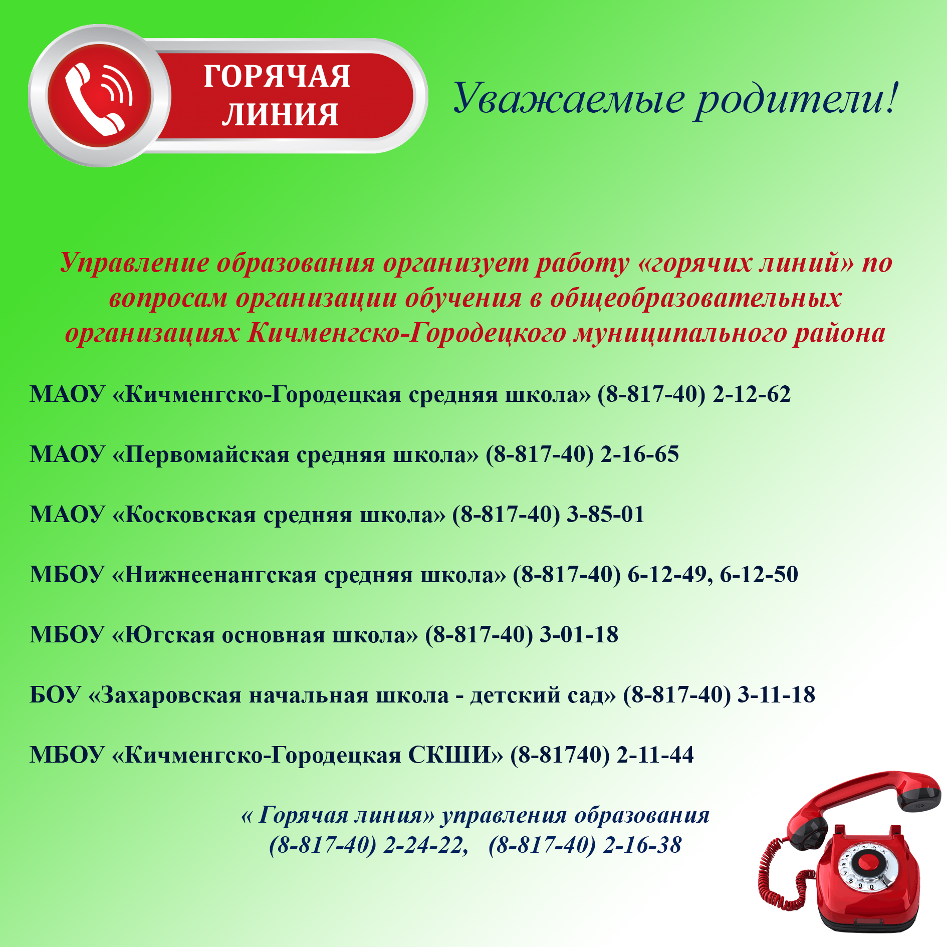 Телефон ГОРЯЧЕЙ ЛИНИИ в управлении образования 2-16-38 (Чурина Татьяна Ивановна)