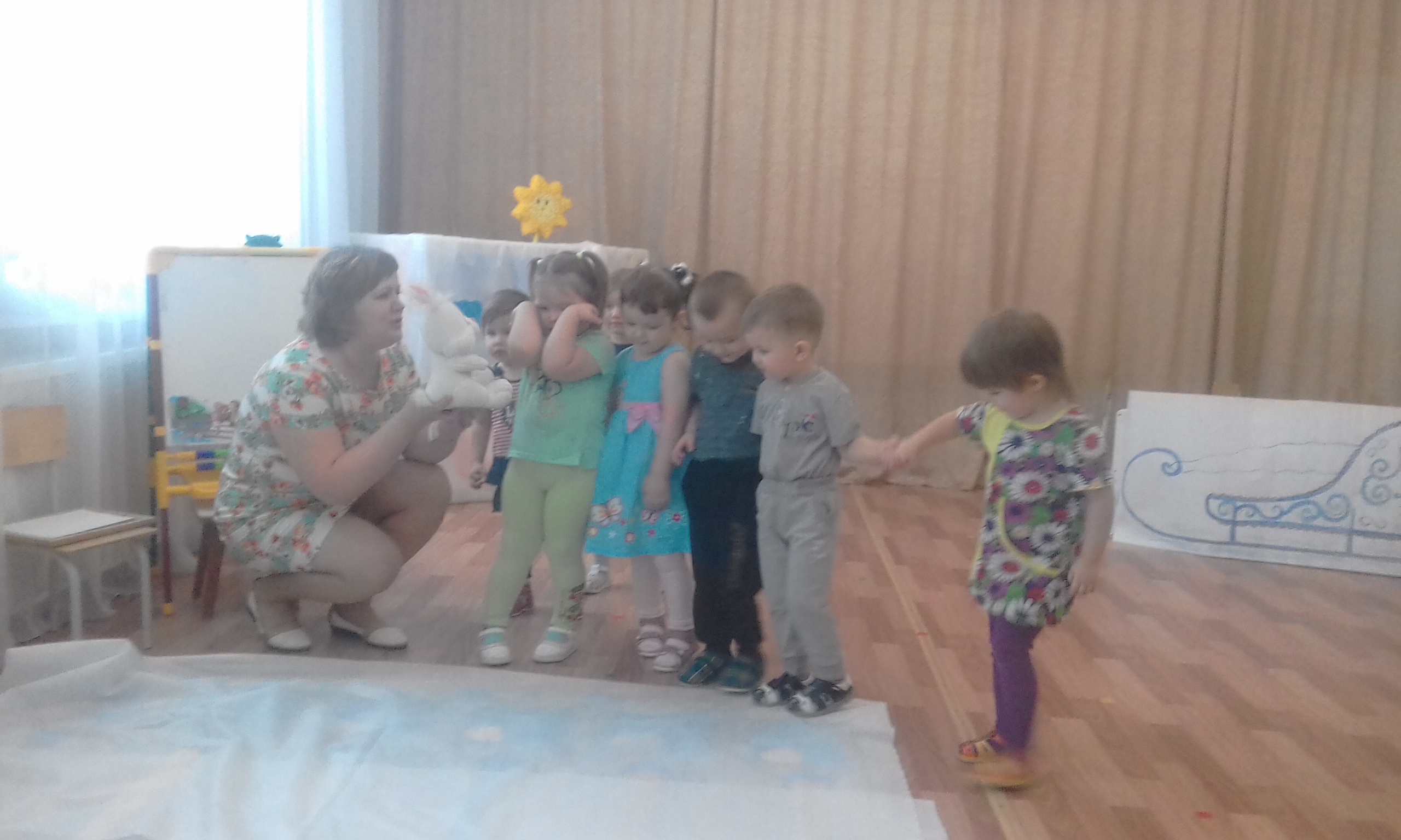 Образовательная деятельность с детьми первой младшей группы на тему «Путешествие с солнышком» (с использованием музыкального сопровождения) была представлена педагогом Киркиной С.Н. Участники семинара заслушали самоанализ педагога и проанализировали образовательную деятельность на предмет организации среды занятия, а также, на предмет использования педагогом нестандартного многофункционального оборудования.