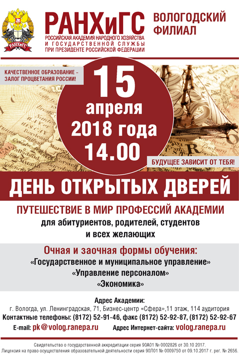 Вологодский филиал Президентской Академии (РАНХиГС) объявляет набор на 2018-2019 учебный год НА ОЧНУЮ ФОРМУ ОБУЧЕНИЯ на базе среднего общего образования по направлениям подготовки бакалавров «ГОСУДАРСТВЕННОЕ И МУНИЦИПАЛЬНОЕ УПРАВЛЕНИЕ» (ЕСТЬ БЮДЖЕТНЫЕ МЕСТА), «ЭКОНОМИКА» (ЕСТЬ БЮДЖЕТНЫЕ МЕСТА), «УПРАВЛЕНИЕ ПЕРСОНАЛОМ».