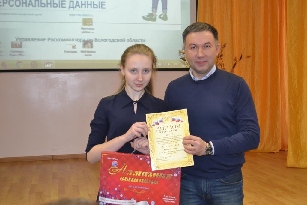 Поблагодарить участников конкурса, вручить дипломы и ценные подарки победителям приехал сотрудник Управления Роскомнадзора по Вологодской области Малахов Алексей Николаевич.